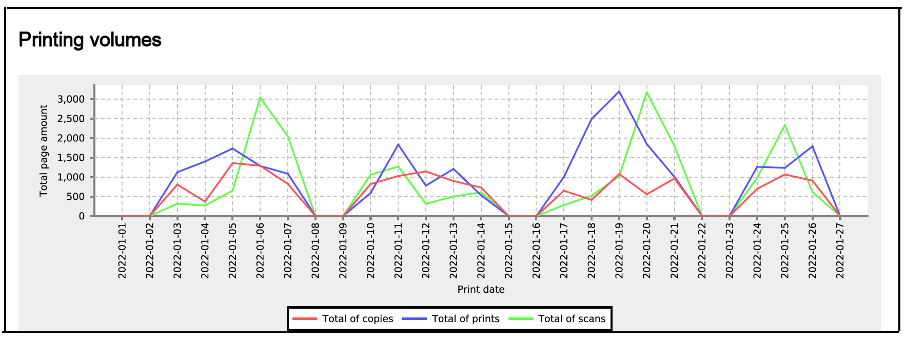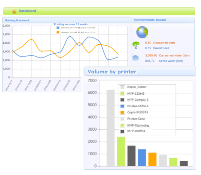 - Conocer al 100% la tendencia de uso de los equipos de impresión: por usuario, departamento, centro de costos y por equipo. Genera Reportes automatizados y detallados.